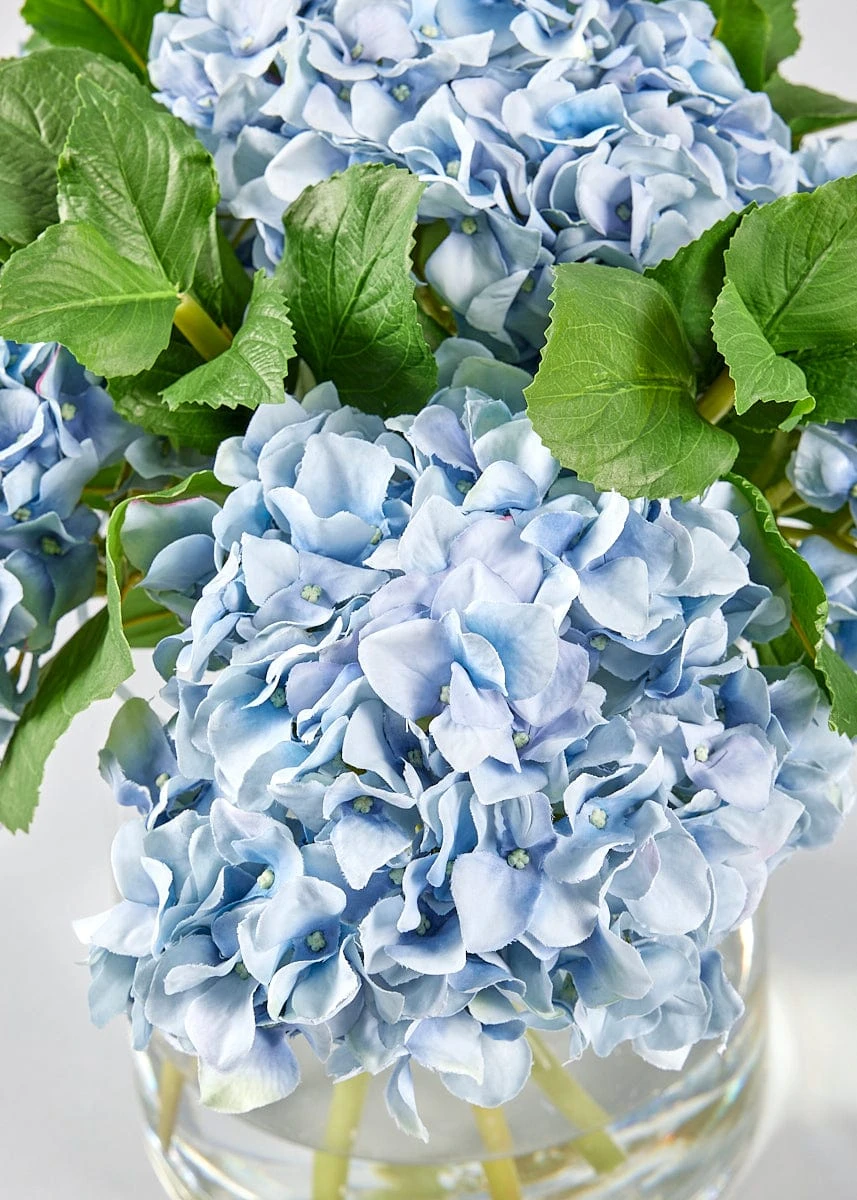 If you want your coffee table to be the focal point in your living space, then this gorgeous artificial hydrangea floral arrangement is the one for you! It has faux hydrangea flowers in blue with soft purple and yellow-green highlights for a more natural appearance. Plus, the blooms’ realistic botanical details instill the feeling of nature, making this glass vase arrangement an elevated interior design piece that brings permanent beauty to the indoors. Stems are styled in acrylic water and cannot be removed.